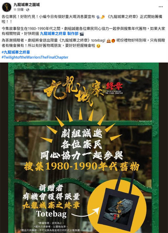 1905电影网讯 近日,电影《九龙城寨之围城》的续集电影《九龙城寨之终章》在社交媒体上宣布,影片已正式开始筹备,将讲述发生在1980-1990年代之间的故事。影片同时发布告示向影迷征集年代旧物,以支援影片拍摄。